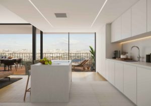 - Superfícies em resina acrílica, onde os tons claros e neutros potenciam a luminosidade e a continuidade visual, especialmente em cozinhas, casas de banho e mobiliário integrado.